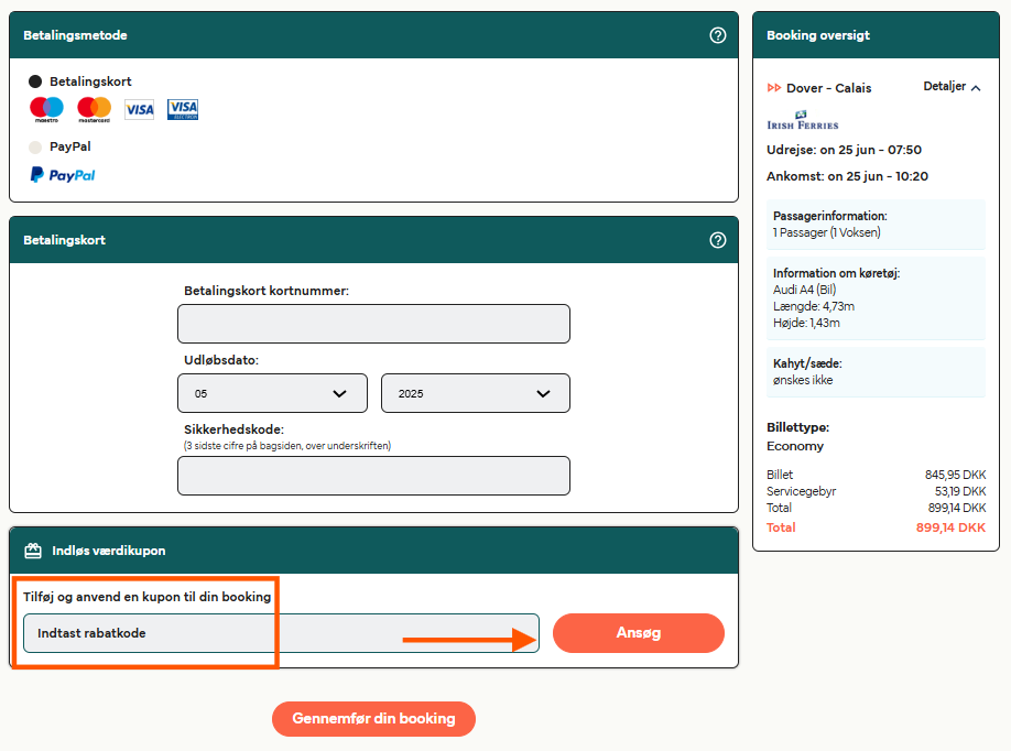Hvis du har modtaget en rabatkode via en platform for ansatte, studerende eller rabatudbydere, skal du sørge for at tilgå Direct Ferries’ hjemmeside via det link, de har givet dig. Du får kun mulighed for at indtaste din rabatkode på betalingssiden, hvis du bruger det specifikke link.