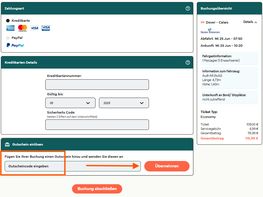 Wenn Sie einen Rabattcode über eine Plattform für Mitarbeitende, Studierende oder Rabattangebote erhalten haben, stellen Sie bitte sicher, dass Sie die Website von Direct Ferries über den bereitgestellten Link aufrufen. Nur wenn Sie diesen spezifischen Link verwenden, erscheint auf der Bezahlseite die Option, den Rabattcode einzugeben.