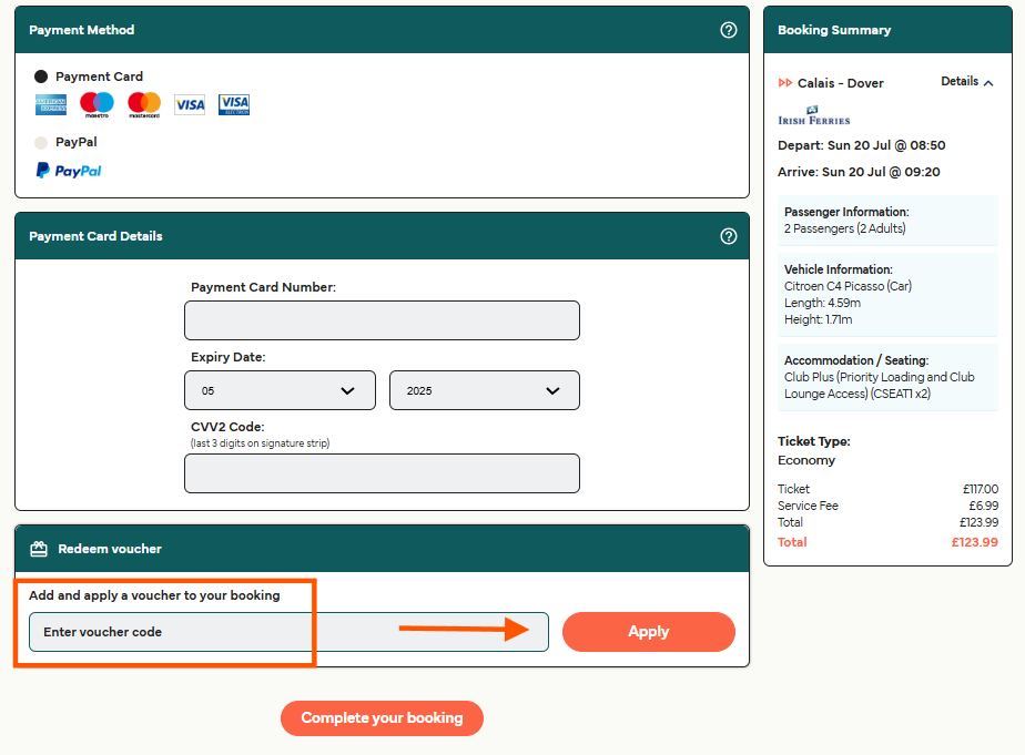 If you’ve received a discount code through an employee, student, or discount provider platform, please make sure to access the Direct Ferries website using the link they’ve provided. You'll only get the option to add your discount code on the payment page when you use that specific link.