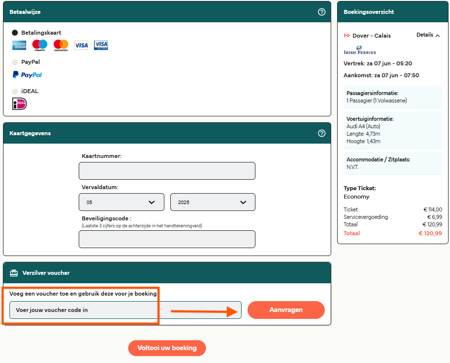 Als u een kortingscode heeft ontvangen via een werknemers-, studenten- of kortingsplatform, zorg er dan voor dat u de Direct Ferries-website bezoekt via de link die zij hebben verstrekt. U krijgt alleen de optie om uw kortingscode toe te voegen op de betaalpagina wanneer u die specifieke link gebruikt.